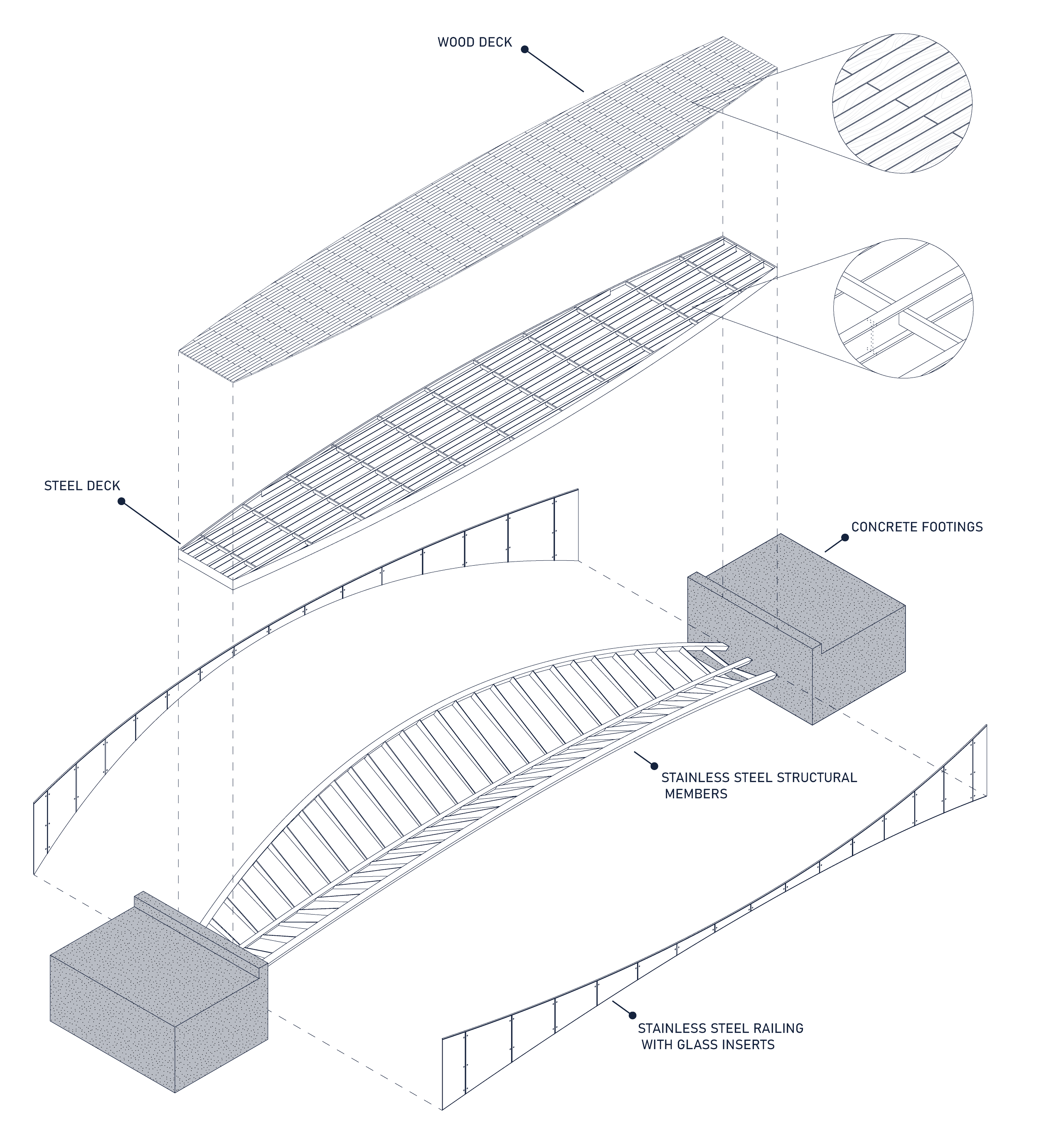 Located on a scenic foot trail in Quebec, the Montmorency Footbridge mimics the form of a White Ash tree leaf native to Quebec. The arch compression bridge is made up of concrete footings, stainless steel structural members, a steel deck and completed with White Ash wood planks for an elegant and clean finish. Visitors are able to connect with the environment through minimized visual barriers between user and surroundings - almost as though they are walking on an open leaf.