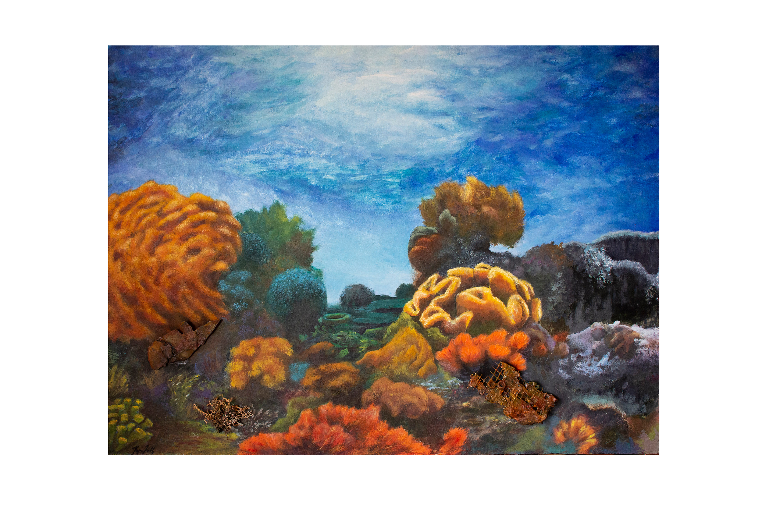 A mixed-media piece about little things that float to the bottom of the ocean and integrate with the surrounding seascape, highlighting the impact of human litter and debris on ecosystems we don’t even see.